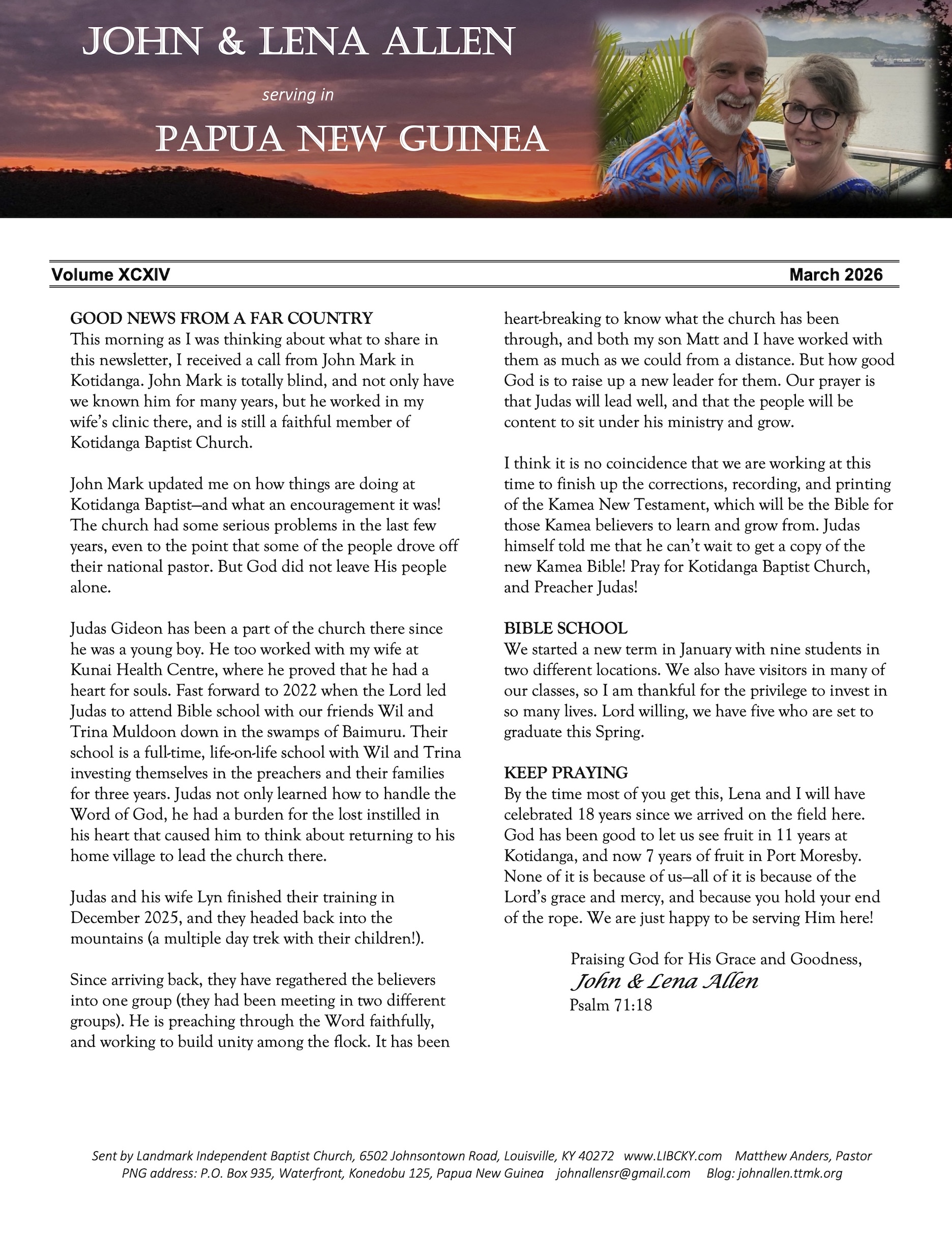 By the time most of you get this, Lena and I will have celebrated 18 years since we arrived on the field here. God has been good to let us see fruit in 11 years at Kotidanga, and now 7 years of fruit in Port Moresby. None of it is because of us—all of it is because of the Lord’s grace and mercy, and because you hold your end of the rope. We are just happy to be serving Him here!